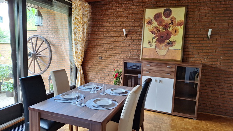 ausgestattet. Vom Esszimmer aus haben Sie über die große Glasschiebetür einen direkten Zugang zur Terrasse und dem Garten. Die sonnige Terrasse zur West-Seite ist ideal für sommerliche Abende und