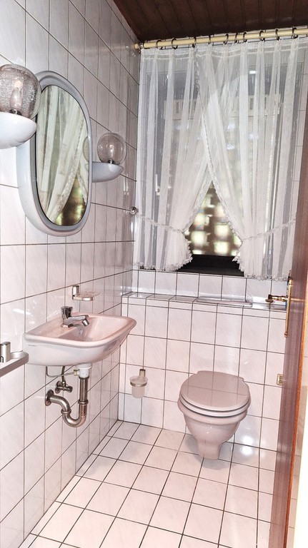 Das Erdgeschoss verfügt derzeit über 4 Zimmer, Küche und Badezimmer mit Dusche. Vom Wohn-/Esszimmer aus erreichen Sie direkt den Garten. Im Obergeschoss stehen weitere 5 Zimmer und ein Badezimmer mit Badewanne zur Verfügung. Die Badezimmer sind im Stil der 80er - 90 er Jahre gestaltet. Im Erdgeschoß sind teilweise Außenrollos vorhanden.