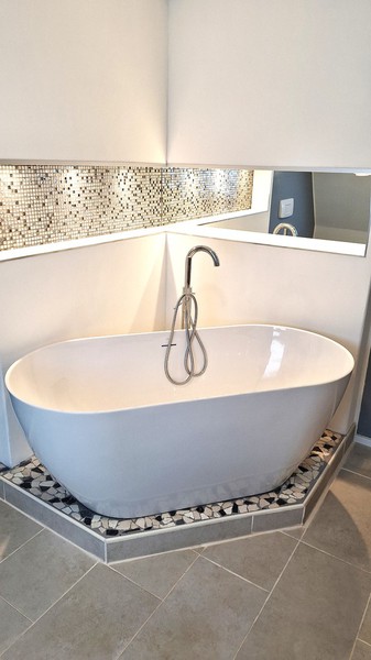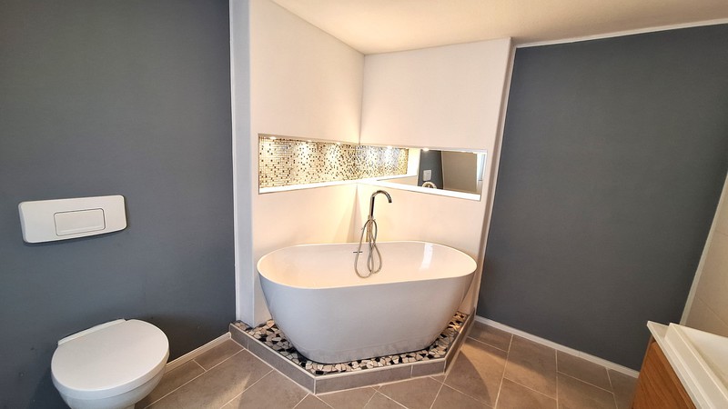 Das individuell und mit viel Liebe zum Detail gestaltete Badezimmer mit einer freistehenden Badewanne befindet sich im Obergeschoss. Durch ein weiteres Zimmer mit